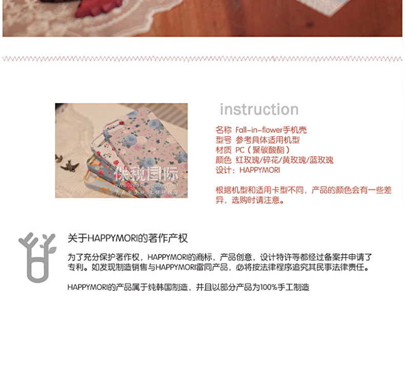韓國Happymori“Fall-in-flower”白底碎花圖案手機殼—— 1.PC材質,耐熱,耐沖擊,抗摔,且不易變形 2.設計簡約,大方,充滿個性! 備注:硬質材料在大的沖擊下容易破損,使用時請格外注意! |