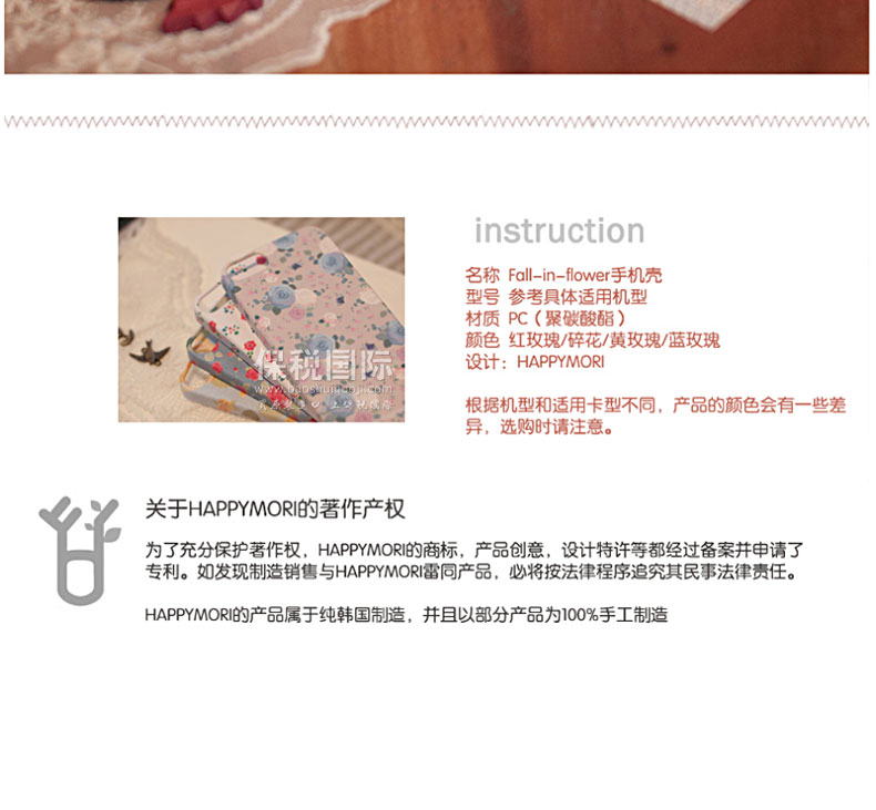 韓國Happymori“Fall-in-flower”黃玫瑰手機(jī)殼—— 1.PC材質(zhì),耐熱,耐沖擊,抗摔,且不易變形 2.設(shè)計(jì)簡(jiǎn)約,大方,充滿個(gè)性! 備注:硬質(zhì)材料在大的沖擊下容易破損,使用時(shí)請(qǐng)格外注意! |