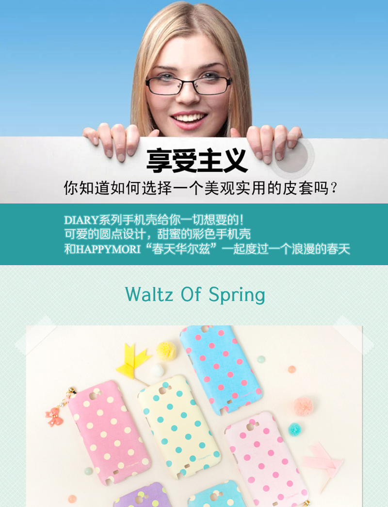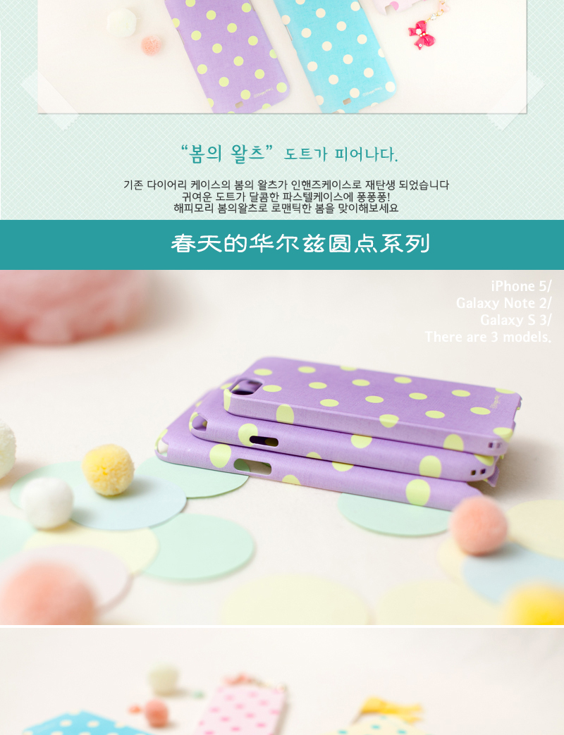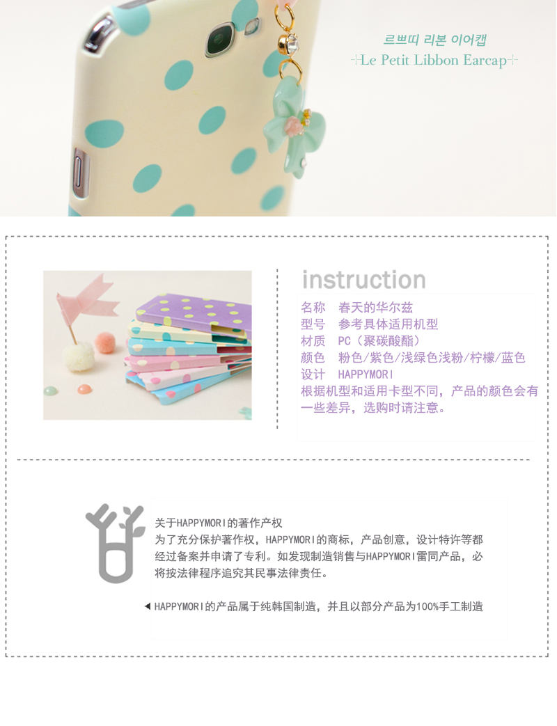 韓國Happymori“春天的華爾茲”淺綠圓點手機殼—— 1.PC材質,耐熱,耐沖擊,抗摔,且不易變形 2.設計簡約,大方,充滿朝氣,可愛的圓點設計,感受春天的清爽 備注:硬質材料在大的沖擊下容易破損,使用時請格外注意! |