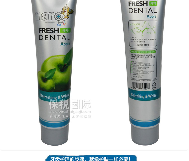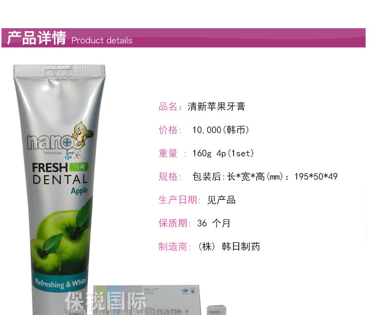 商品名稱 | 韓國韓日制藥HANIL清新蘋果多味水果美白牙膏 160g | ||