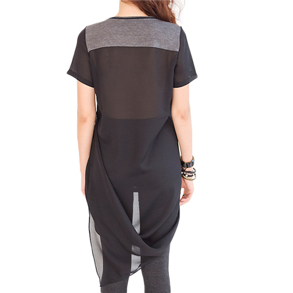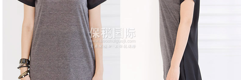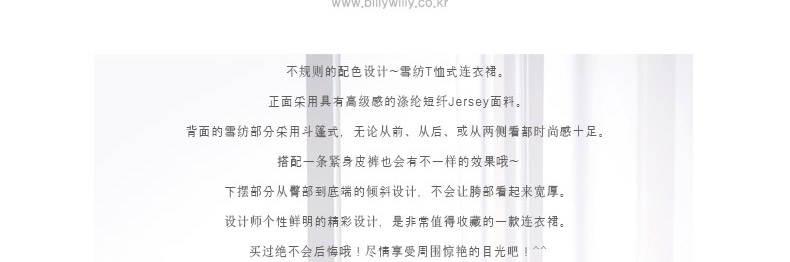 BILLYWILLY SUMMER 不規(guī)則配色T恤連衣裙—— 1.不規(guī)則的配色設(shè)計(jì)~雪紡T恤式連衣裙。 2.正面采用具有高級(jí)感的滌綸短纖Jersey面料。 3.背面的雪紡部分采用斗篷式,無論從前、從后、或從兩側(cè)看都時(shí)尚感十足。 4.搭配一條緊身皮褲也會(huì)有不一樣的效果哦~ |