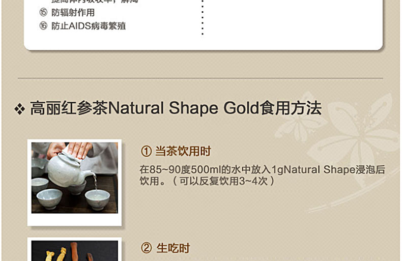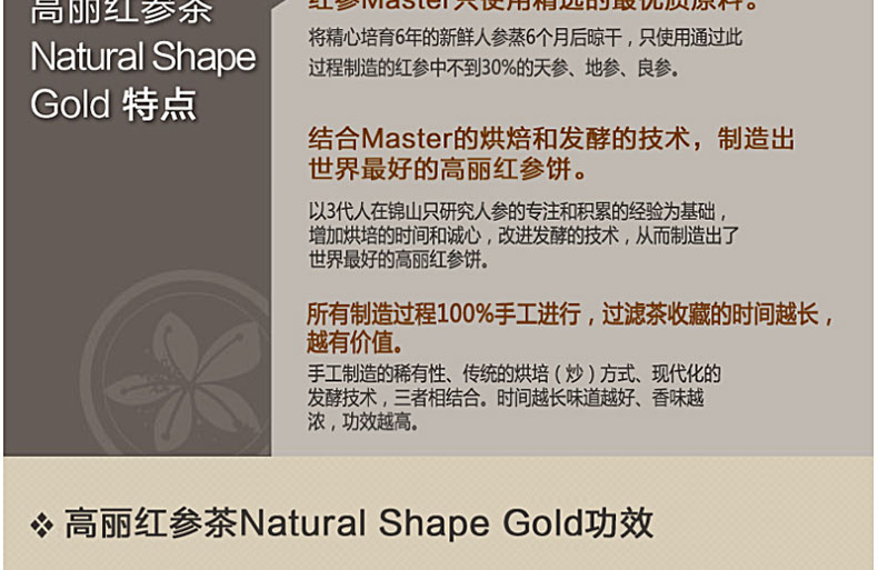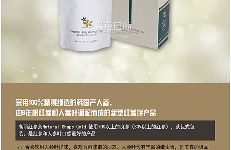 韓國保健營養食品 金茶陶 高麗紅參茶 NATURAL SHAPE GOLD 50g/包 盒裝—— 1.主要使用70%以上的良參(30%以上的紅參),其味道的豐富性和產品的稀缺性使之非常珍貴 2.葉茶式的密封包中裝入紅參瓶,攜帶方便的產品。 3.結合韓國金茶陶的烘焙和發酵技術的訣竅生產而成,和過濾茶一起作為食材,是食用佳品。 |
