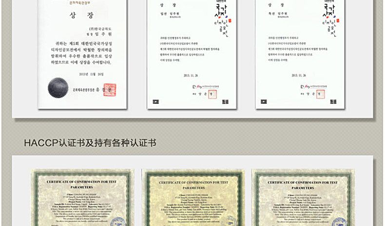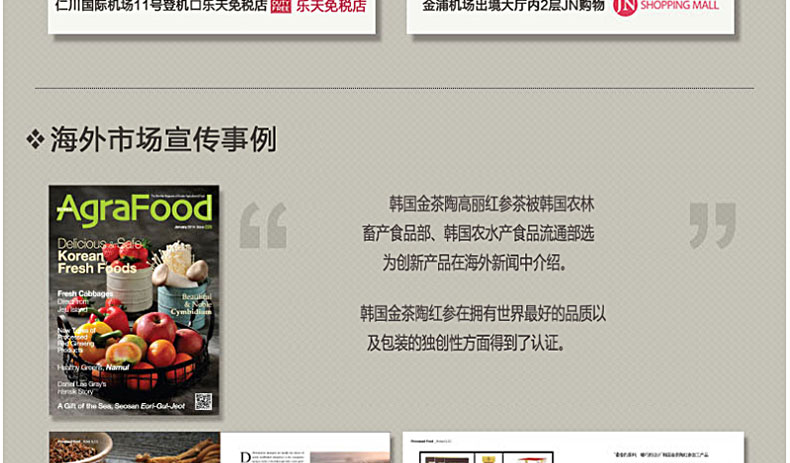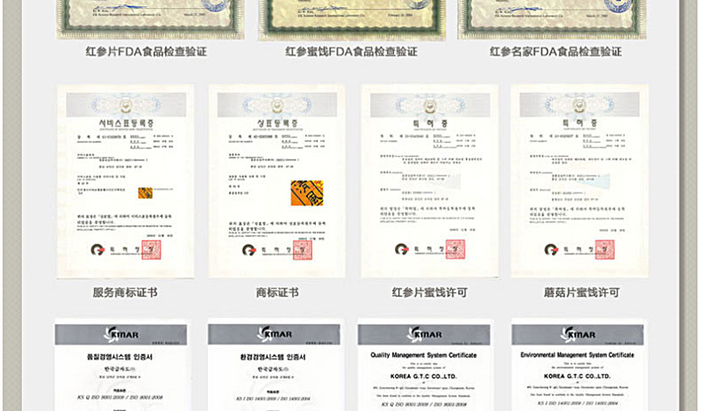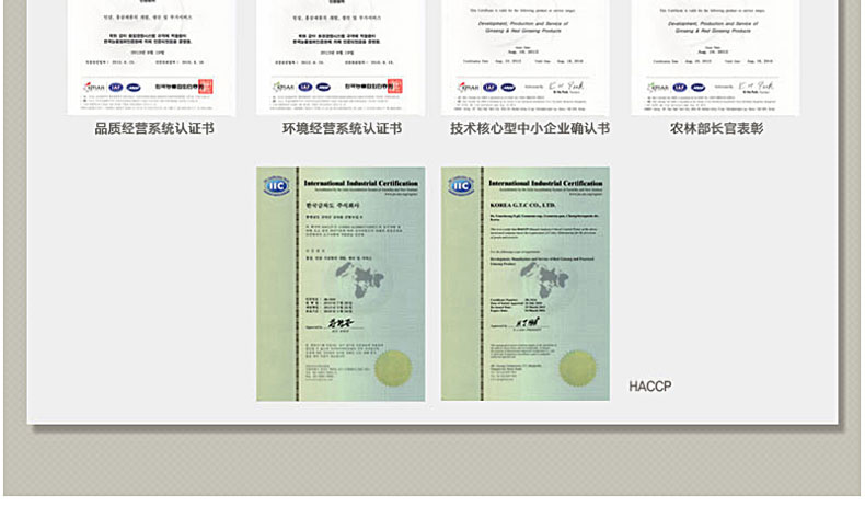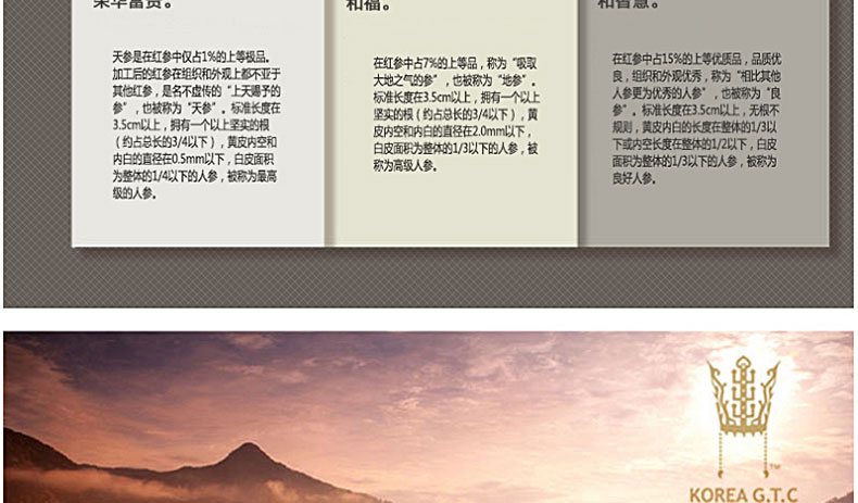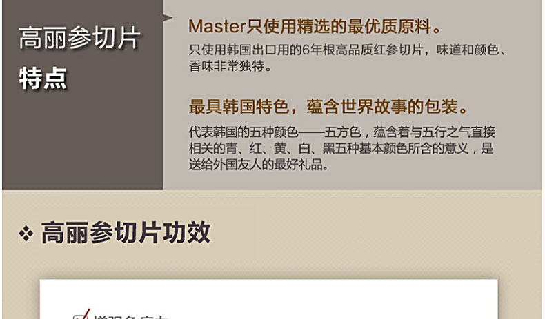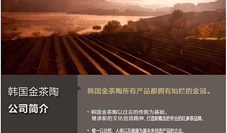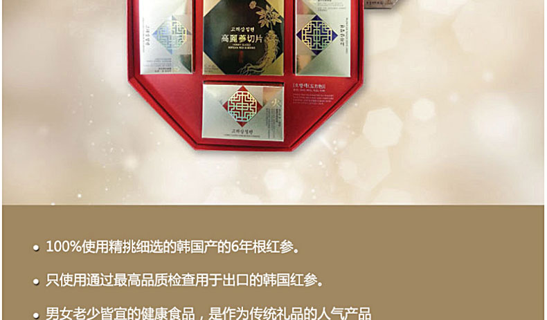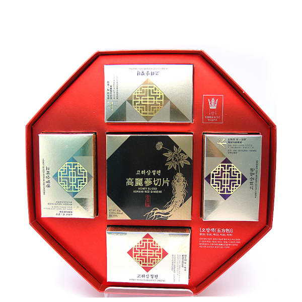 韓國保健營養(yǎng)食品 金茶陶 高麗參切片 10袋/盒 200g—— 1.使用100%韓國產(chǎn)嚴格挑選的6年紅參。 2.只使用通過最高品質(zhì)檢查用于出口的韓國紅參。 3.男女老少皆宜的健康食品,是作為傳統(tǒng)禮品的人氣商品。 4.代表韓國的五種顏色——五方色,蘊含著與五行之氣直接相關(guān)的青、紅、黃、白、黑五種基本顏色所含的意義,是送給外國友人的最好禮品。 |