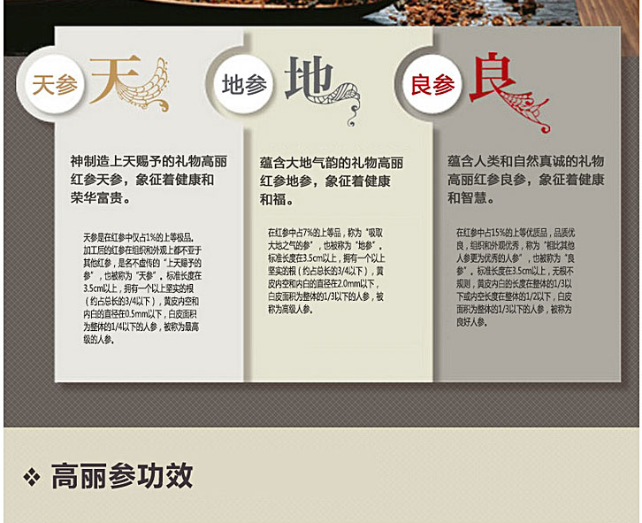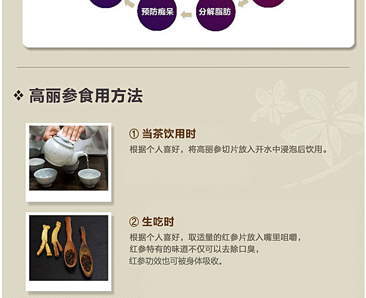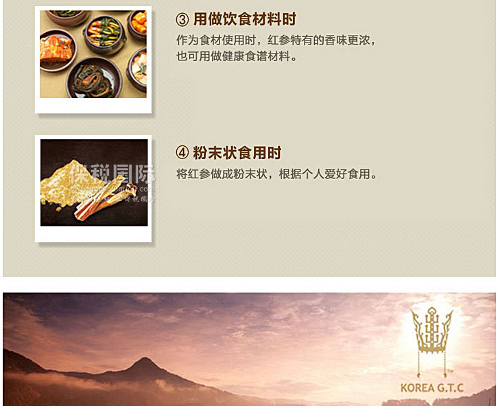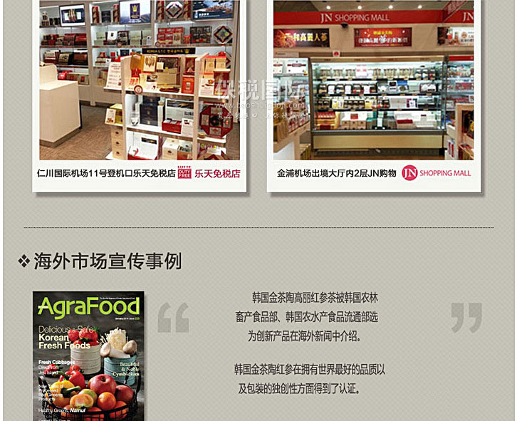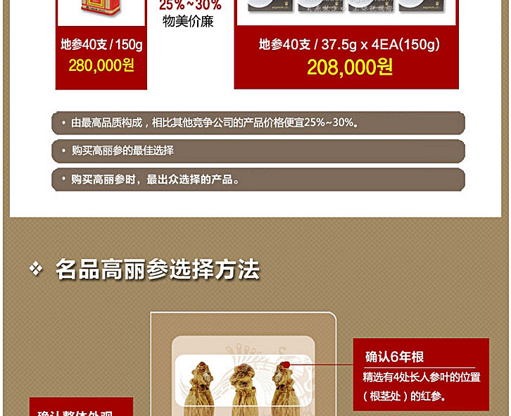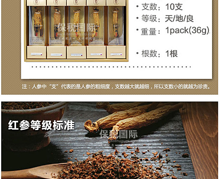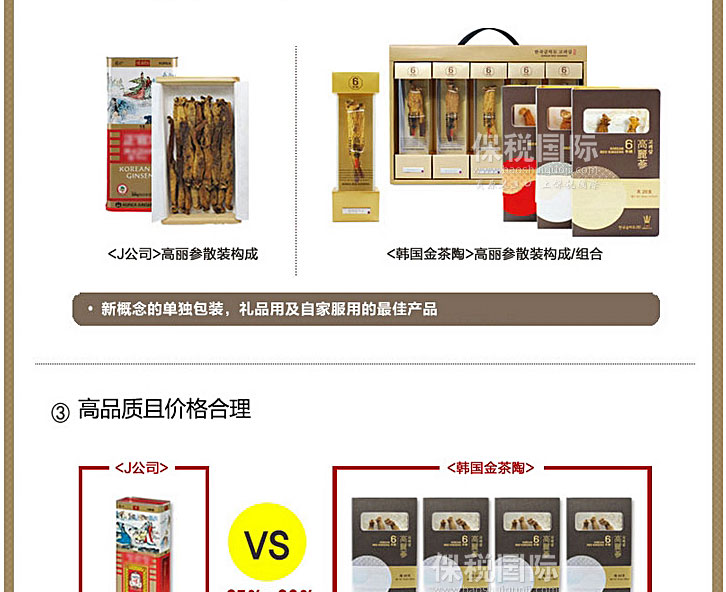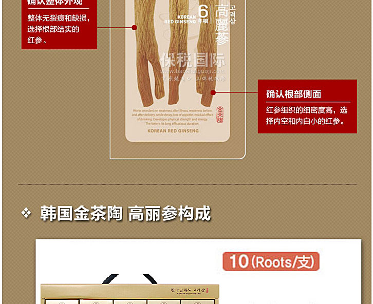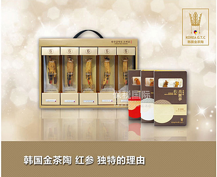 韓國(guó)保健營(yíng)養(yǎng)食品 金茶陶 高麗紅參10支1個(gè)裝/盒 —— 1.采用新概念透明包裝,方便直接用肉眼觀察紅參的品質(zhì)指標(biāo)根莖和組織的細(xì)密度。 2.與普通的罐裝參容量不同,以少量的支數(shù)/重量細(xì)分化,可以組合銷售及單獨(dú)銷售,擴(kuò)大消費(fèi)者選擇范圍。 3.單獨(dú)包裝,方便攜帶貯藏,是送禮佳品。 |