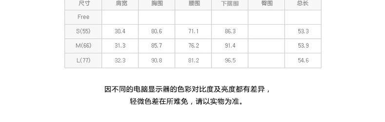 55 (肩寬30.4/胸圍80.6/總長53.3) 66 (肩寬31.3/胸圍85.7/總長53.9) 77 (肩寬32.3/胸圍 90.8/總長54.6) |
