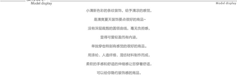 BILLYWILLY彈力打底無袖背心—— 糖果顏色裝飾的基本背心T恤。 小清新色彩的條紋裝飾,給予清涼的感覺,是能很好襯托夏日清爽的商品。 沒有深層裁剪的圓領曲線,毫無負擔感,顯得可愛輕盈而有內涵,單獨穿也特別有感覺的商品。 用滌綸、人造纖維、混紡材料制作而成,柔軟的手感和舒適的伸縮感讓您穿著舒適,可以給你隱約裝飾感的商品,各種顏色都特別推薦。 |
