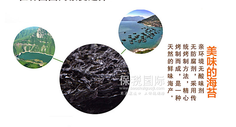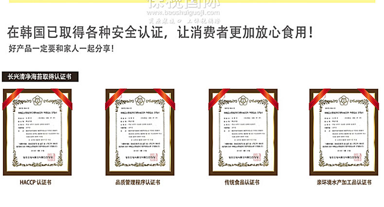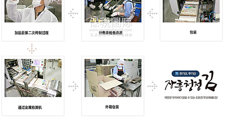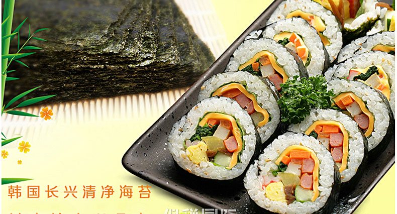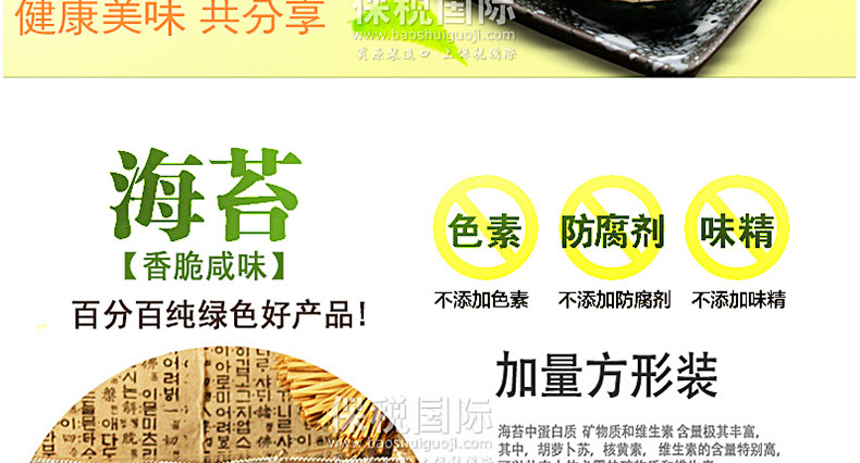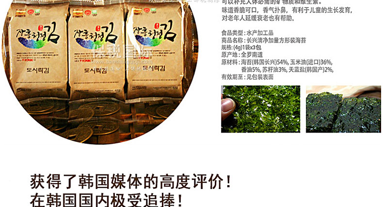 長興清凈海苔 加量方形裝 攜帶方便 美味可口(4g*3包/袋)— — 1)本品采用全羅南島長興郡出產的無污染海苔,加入菜籽油,香油,鹽等各種調料制成。 2)HACCP 加工工程認證的可以放心食用的無酸海苔。 3)開袋即食,拌米飯吃口感更佳。 |