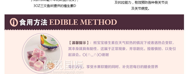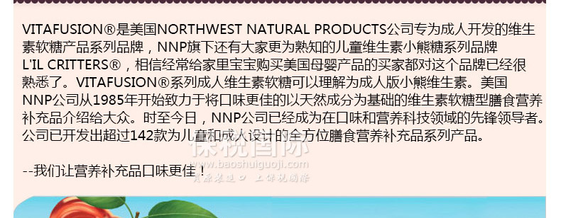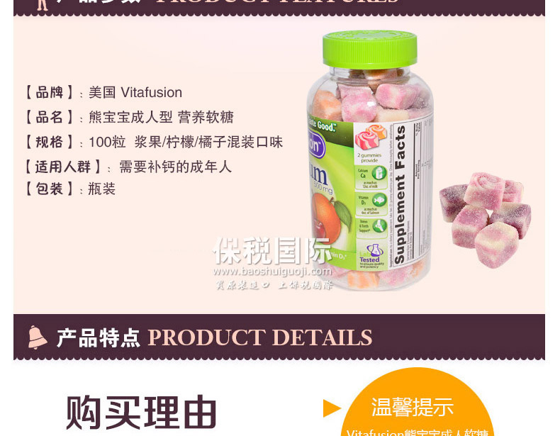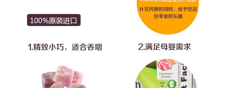 美國麗貴Vitafusion熊寶寶成人型Calcium鈣+VD軟糖 香甜可口 營養豐富 100粒*2瓶/套 —— 1.非特殊需求時,不要超過建議用量。 2.如果你正在用藥或正在懷孕或哺乳,請不要服用本產品。有醫生的指導才能使用。 3.請放在兒童接觸不到的地方。 |