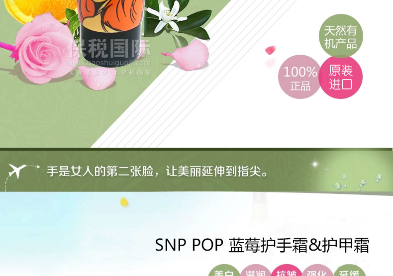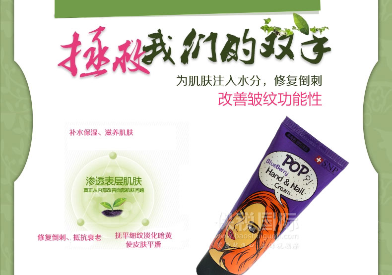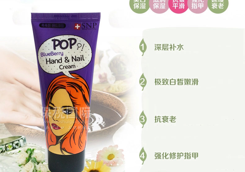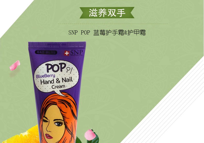 韓國人氣藥妝SNP POP 藍莓護手霜&護甲霜 100g—— 1. 一款改善皺紋功效型化妝品。 2. 軟管狀,攜帶方便。 3. 柔和不油膩。 4. 牛油樹脂成分不油滑,形成絲滑保護膜。 5. 含角蛋白,具有強化指甲功能。 |