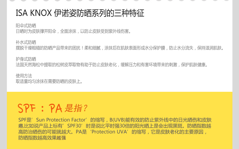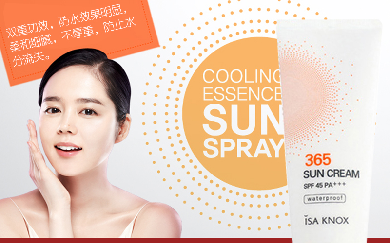 | 產(chǎn)品說明 | 韓國 ISA KNOX 伊諾姿 365防曬霜 送贈(zèng)品套裝 70ml—— ISA KNOX 伊諾姿365防曬霜 隔離霜和日常防曬霜雙重功效 隔離霜和日常防曬霜兩用(已通過防水測(cè)試) 涂抹一次后紫外線切斷效果長(zhǎng)久持續(xù),且防水效果明顯, 出汗也不易脫落,粉底和日常防曬霜兩用。 柔和細(xì)膩,不厚重,易于涂抹均勻,在皮膚表面形成一層薄薄的保護(hù)膜,防止水分流失。 | |||