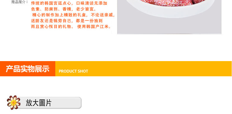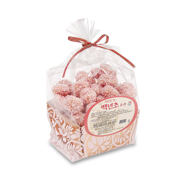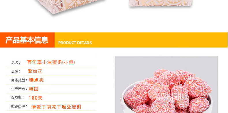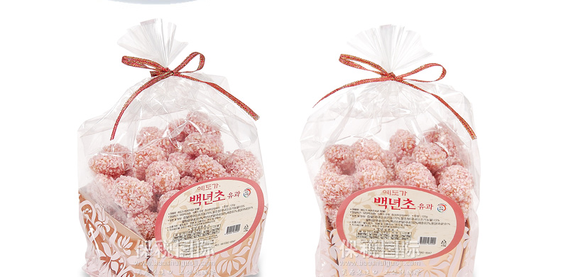 韓國傳統(tǒng)食品/點心 愛如花 百年草小油蜜果(小包)—— 1. 傳統(tǒng)的韓國宮廷點心,口味清談無添加色素、防腐劑、香精,老少皆宜。 2. 精心的制作加上精致的禮盒,不論送親戚,送朋友還是犒勞自己,都是一份獨到而且賞心悅目的禮物。 3. 使用韓國產(chǎn)江米。 |