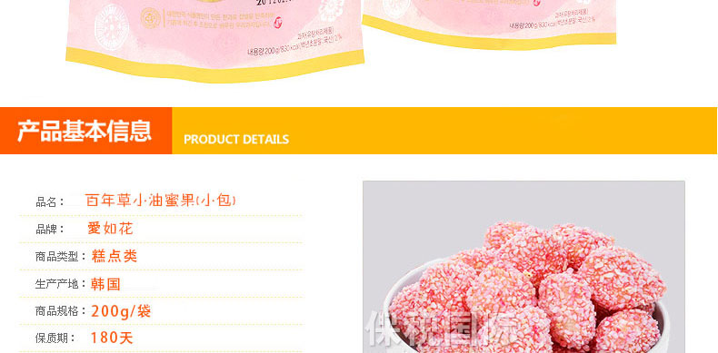 韓國傳統食品/點心 愛如花 百年草油蜜果(小包)—— 1. 傳統的韓國宮廷點心,口味清談無添加色素、防腐劑、香精,老少皆宜。 2. 精心的制作加上精致的禮盒,不論送親戚,送朋友還是犒勞自己,都是一份獨到而且賞心悅目的禮物。 3. 物美價廉的damyang韓果企劃商品! 4. 韓國食品名人制造的韓果, 采用江米,油炸后,拌糖稀而制的傳統油蜜果。 |