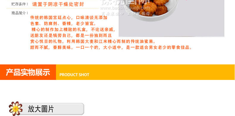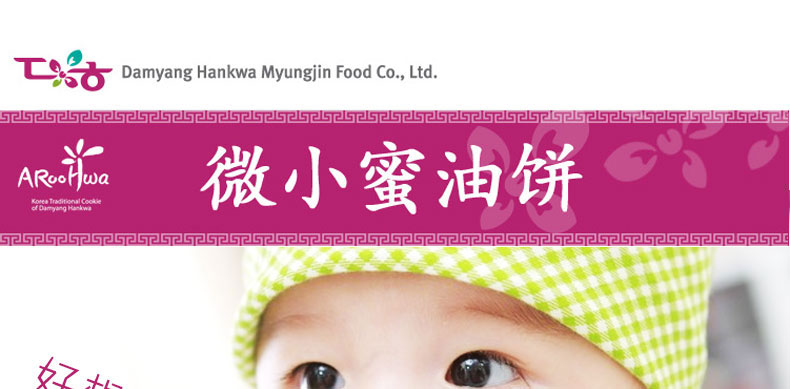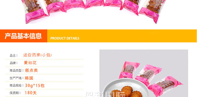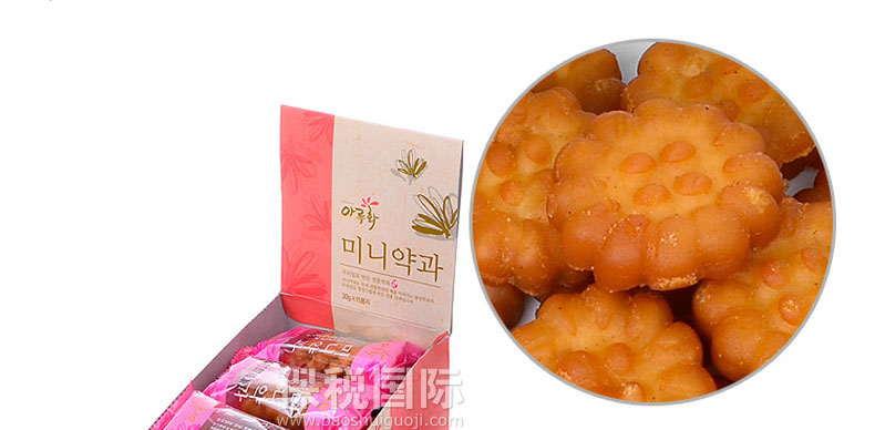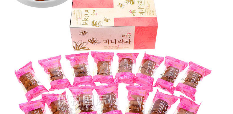 韓國傳統食品/點心 愛如花 迷你藥果(小包) 15包/盒—— 1. 傳統的韓國宮廷點心,口味清談無添加色素、防腐劑、香精,老少皆宜。 2. 精心的制作加上精致的禮盒,不論送親戚,送朋友還是犒勞自己,都是一份獨到而且賞心悅目的禮物。 3. 利用韓國大麥和江米精心而制的傳統油蜜果。 4. 甜而不膩,香醇美味。一口一個的,大小適中,是一款適合男女老少的零食佳品。 |