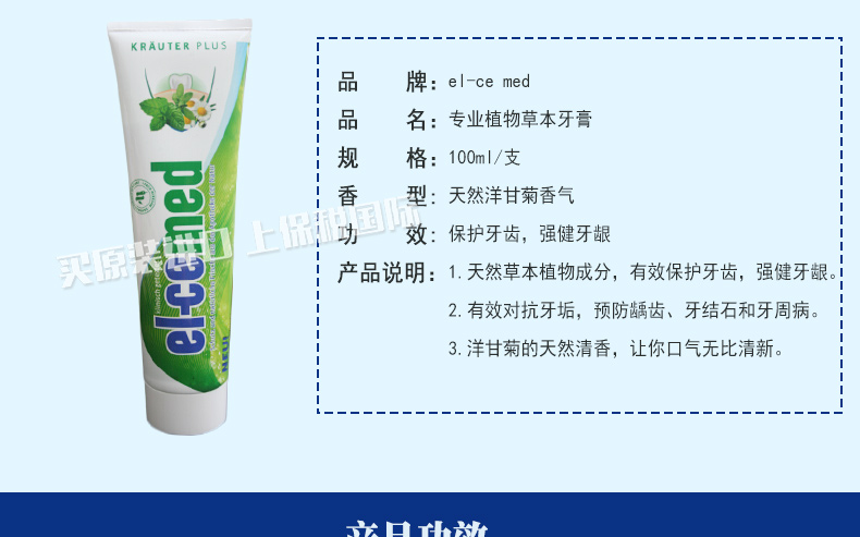 德國 el-ce med艾爾美 專業植物草本牙膏 保護牙齒強健牙齦 成人適用 100ml/支 —— 1.天然草本植物成分,有效保護牙齒,強健牙齦。 2.有效對抗牙垢,預防齲齒、牙結石和牙周病。 3.洋甘菊的天然清香,讓你口氣無比清新。 |