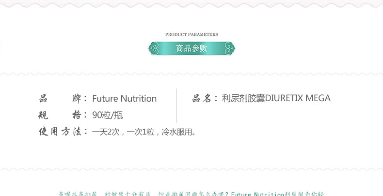 加拿大Future Nutrition 利尿劑膠囊DIURETIX MEGA 傳統的利尿保健品 90粒/瓶—— 1、它是由牛蒡,蕁麻,蒲公英玄參和杜松提取物精華生產而成。 2、它利用最傳統的方法利尿,讓你順暢到底。 |