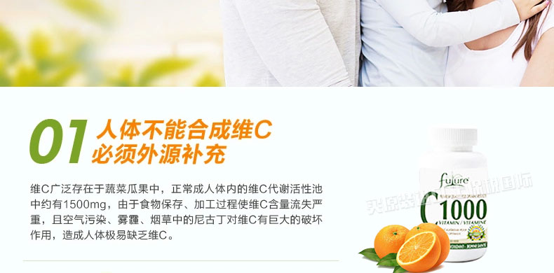 加拿大 Future Nutrition 維生素C1000(VITAMIN C1000)膠囊 促進身體的新陳代謝保健品 90粒/瓶—— 1.醫學成份:維生素C 1000毫克 2.非醫學成份:微晶纖維素,硬脂酸鎂,羥丙甲纖維素(素食膠囊) 3.服用方法:14-18歲:一天一次,一次1粒:成年人:一天2次,一次1粒 ,冷水服用 4.儲存方法:請將產品存放陰涼,干燥的地方;防止幼童食取。如果瓶蓋有破損,請勿使用。 本產品不含有糖,鹽,淀粉,酵母,小麥,面粉,玉米,黃豆,牛奶,乳糖,雞蛋,貝類,防腐劑,人工色素,人工香精,亞硝酸鹽。素食者可以服用。 |