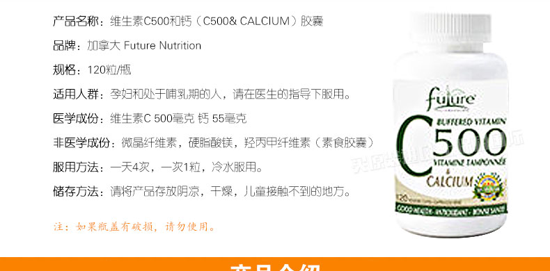 加拿大 Future Nutrition 維生素C500和鈣(C500& CALCIUM)膠囊 有助于骨骼和軟骨的發育保健品 120粒/瓶—— 1.醫學成份:維生素C 500毫克 鈣 55毫克 2.非醫學成份:微晶纖維素,硬脂酸鎂,羥丙甲纖維素(素食膠囊) 3.服用方法:一天4次,一次1粒,冷水服用。 4.儲存方法:請將產品存放陰涼,干燥的地方;防止幼童食取。如果瓶蓋有破損,請勿使用。 本產品不含有糖,鹽,淀粉,酵母,小麥,面粉,玉米,黃豆,牛奶,乳糖,雞蛋,貝類,防腐劑,人工色素,人工香精,亞硝酸鹽。素食者可以服用。 |