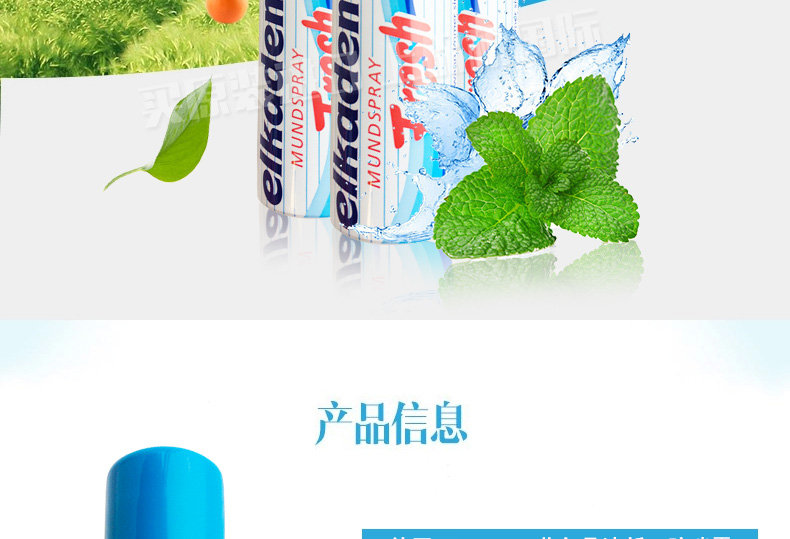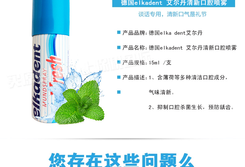 德國(guó)elkadent 艾爾丹清新口腔噴霧 祛異味祛口臭口氣清新劑15ml/支—— 1、含薄荷等多種清潔口腔成分,氣味清新。 2、抑制口腔殺菌生長(zhǎng),預(yù)防齲齒。 |