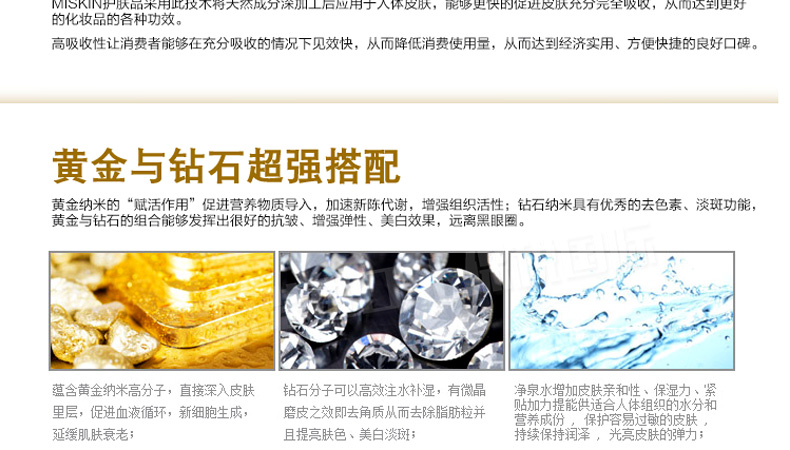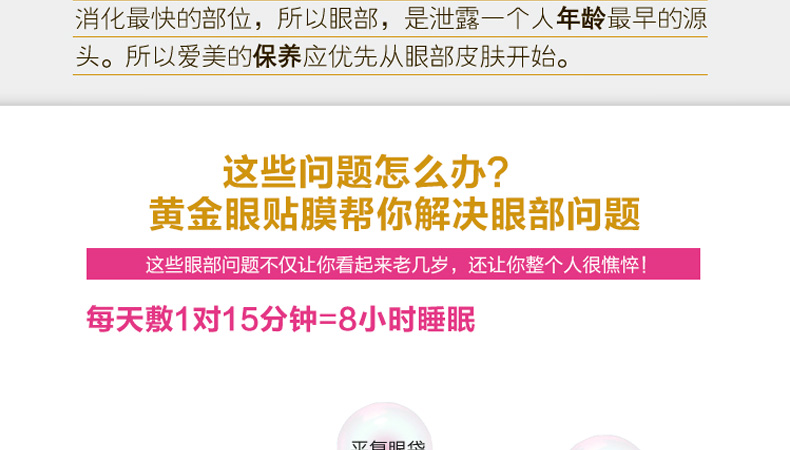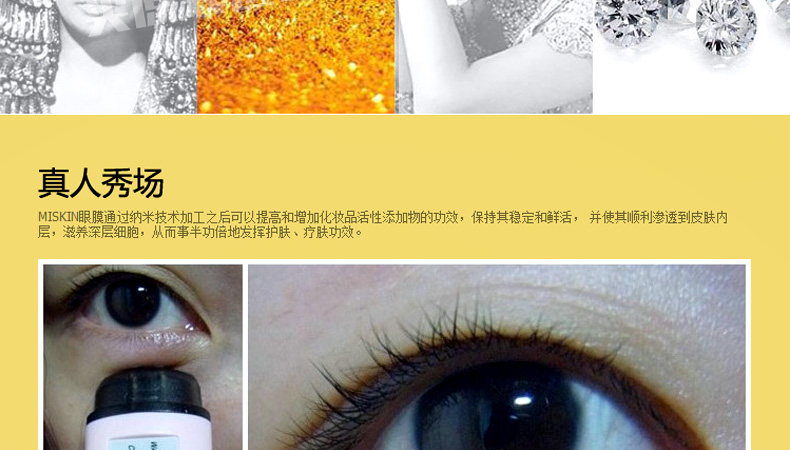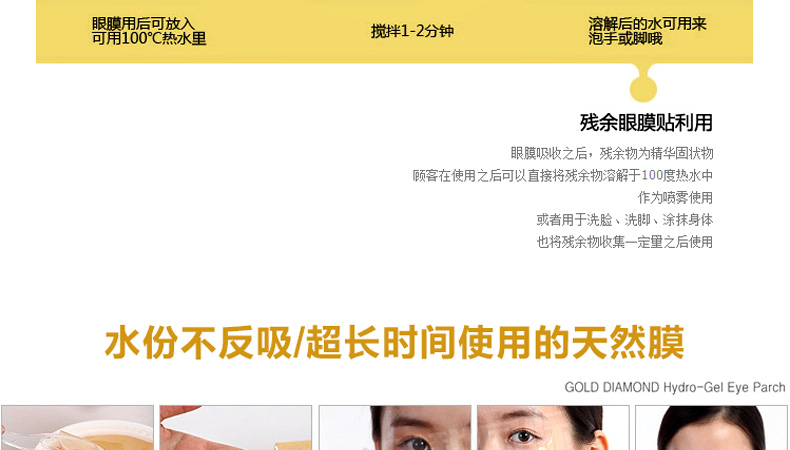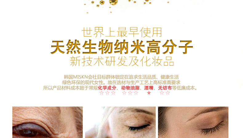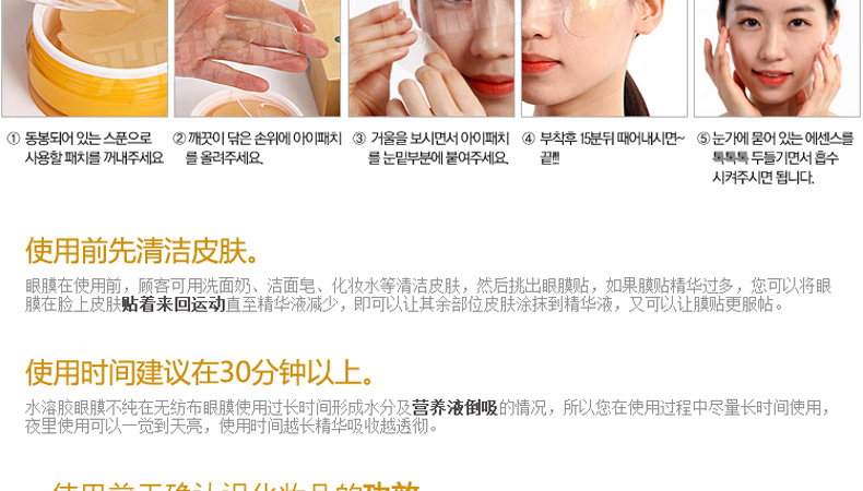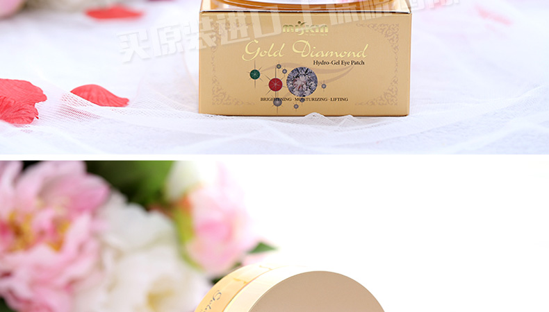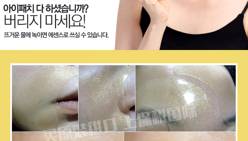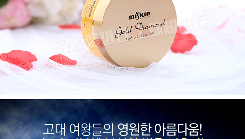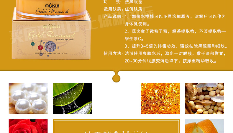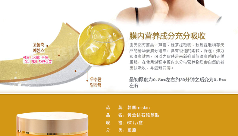 韓國miskin 黃金鉆石眼膜貼 祛黑眼圈特效祛細紋祛眼袋眼貼 多功能眼貼30對(60片/盒)—— 1、加熱水攪拌可以還原溶解原液,溶解后可以作為身體乳使用。 2、蘊含金子微粒子粉,綠茶提取物,蘆薈提取物—維生素C。 3、提升3~5倍的排毒功效,強效祛除黑眼圈和細紋。 使用方法:潔面使用爽膚水后,取出一對眼膜,敷于眼部位置,20~30分鐘眼膜變薄后取下,按摩至精華吸收。 |