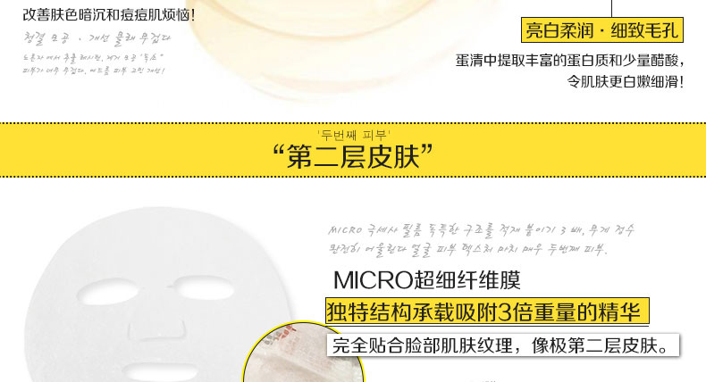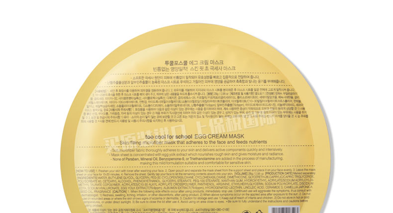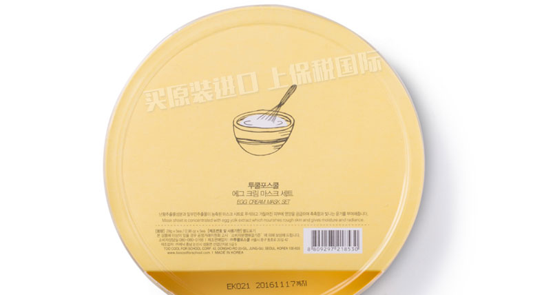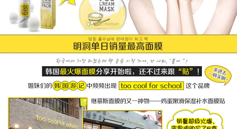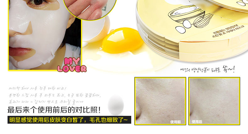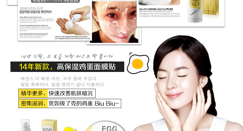 韓國(guó)too cool for school egg 雞蛋面膜貼 讓你的肌膚像剝了殼的雞蛋一樣 28g*5片—— 1.蛋黃的主要成分是17.5%的蛋白質(zhì),32.5%的脂肪,48%的水和2%的礦物質(zhì),可以幫助促進(jìn)一些油溶性物質(zhì)更加容易被皮膚所吸收。 2.適合敏感肌膚或是油性,混合性及毛孔粗大肌膚的清潔使用。 3.較之前的Egg Mousse Pack面膜更方便,此面膜貼使用一次的效果,堪比瓶裝egg慕斯面膜十次。 |