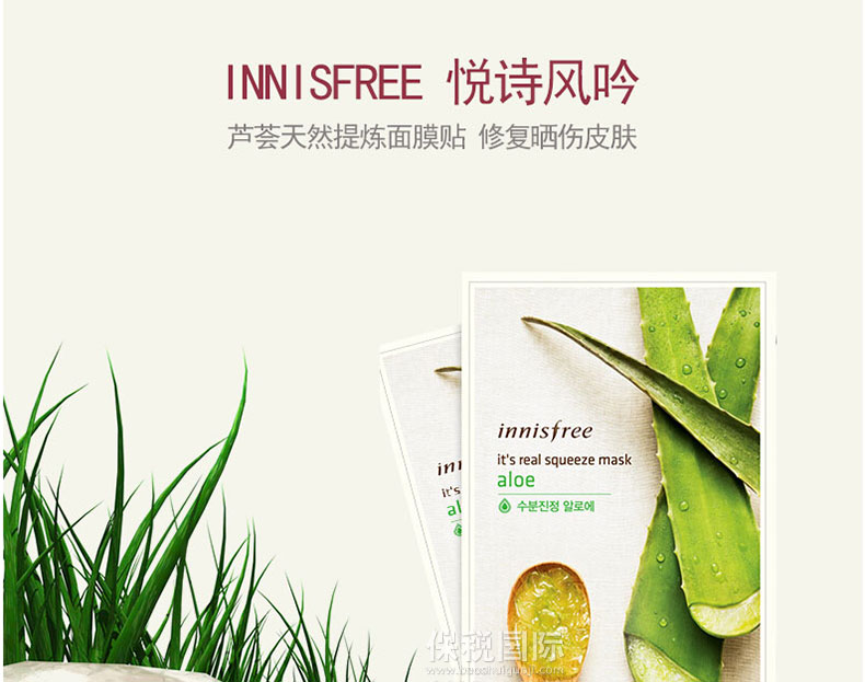 韓國innisfree悅詩風吟蘆薈面膜貼天然補水舒緩鎮(zhèn)靜10片裝/20片裝—— ①貼合感 ②為眼下干燥的肌膚特制的貼心面膜 ③3層滲透補水技術(shù)令面膜持久保濕 ④蘊含濟州島自然復合成分(綠茶、柑橘、仙人掌、山茶葉、蘭科植物),健康肌膚。 |
