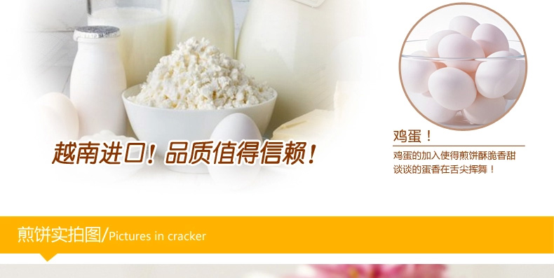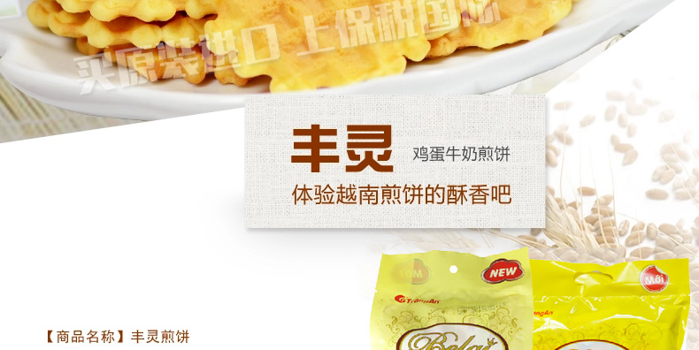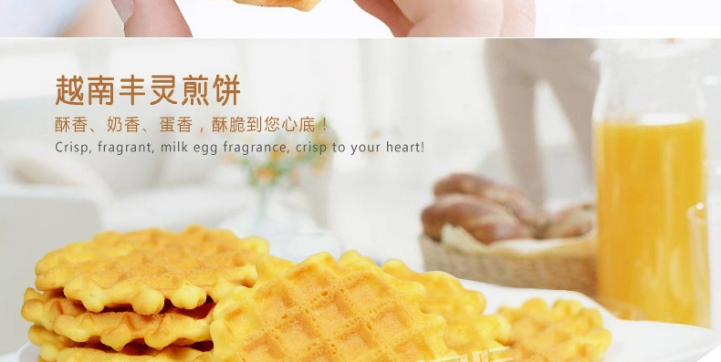 越南豐靈煎餅 獨立小包裝 雞蛋牛奶芝麻花生味 雞蛋牛奶味 兩種口味可選 美味又健康 18包/袋 —— 1、雞蛋牛奶芝麻花生味煎餅,完美融合,營養(yǎng)美味。 2、雞蛋牛奶味煎餅,蛋香濃郁,原汁原味。 |