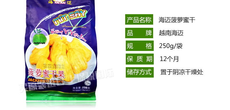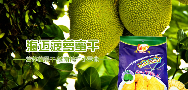 海邁菠蘿蜜干 營養蔬果干 越南特產小零食 250g/袋—— 1、菠蘿蜜干以新鮮菠蘿蜜為原料生產而成。 2、無任何添加劑和其他成分,安全又天然食品。 3、酸甜可口,營養十足,美味不容錯過。 |