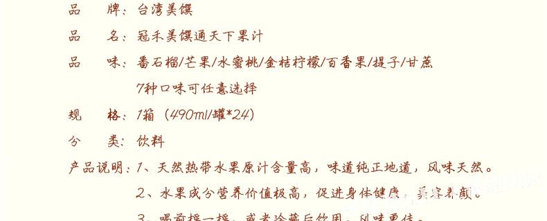 臺灣美饌冠禾通天下果汁 番石榴/芒果/水蜜桃/金桔檸檬/百香果/提子/甘蔗 7種口味可任意選擇 490ml/罐*24罐/箱 |