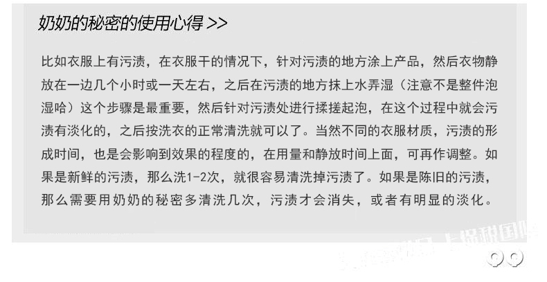 美國Grandma's Secret老奶奶秘密 衣物去漬清潔劑 去污神器 居家必備 59ml/瓶—— 1、污漬處簡單涂抹,使用方便。 2、滴管設計,用量更省,更實惠。 3、天然配方,成分溫和,不傷衣物不傷手。 4、實踐證明:涂抹之后,放置時間越久,效果越好。 |