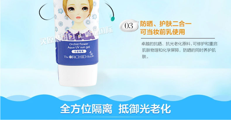 韓國THE RCHID SKIN幽蘭娃娃夏天清爽防曬霜 藍色裝 SPF50 防曬隔離 補水保濕 50ml/瓶—— 1、質地溫和不刺激,敏感肌膚和兒童肌膚也能使用。 2、防曬的同時隔離紫外線,延緩皮膚衰老。 3、輕薄透氣不黏膩,防曬隔離,補水保濕。 |