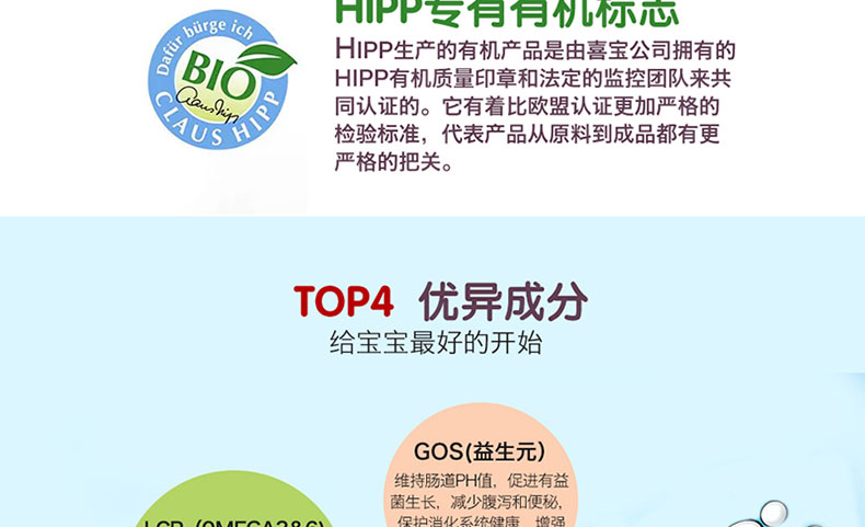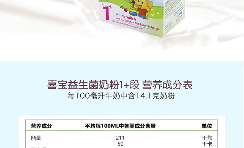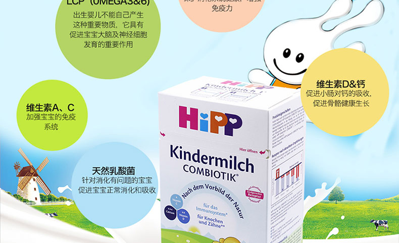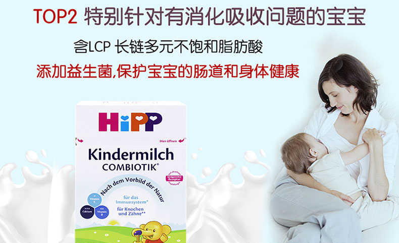 德國喜寶HiPP奶粉益生菌幼兒奶粉4段1+ 600g/罐 1-2周歲 2罐裝 —— ①歐盟認證的有機食品,減少腹瀉及便秘,提供寶寶1~2歲內(nèi)健康成長所必需的營養(yǎng)成分。 ②特別添加益生菌,有助于建立有益菌群,幫助寶寶消化吸收。 ③不添加蔗糖、增稠劑以及人工添加劑 ④富含天然乳酸含多鏈不飽和脂肪酸LCP,助于促進寶寶大腦及神經(jīng)發(fā)育。 注:奶粉包裝更新?lián)Q代頻繁,請以收到實物為準。 |