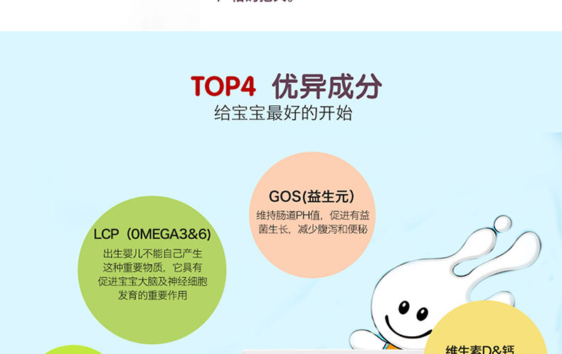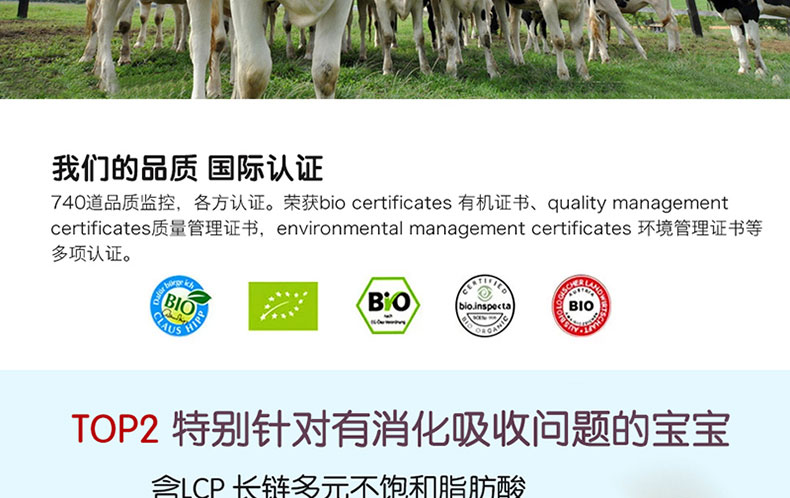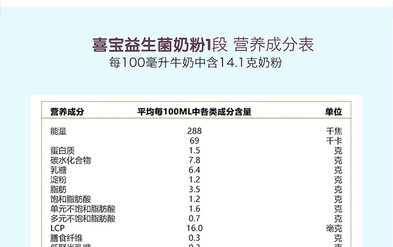 1. 歐盟認證的有機食品,減少腹瀉及便秘,提供寶寶0-6個月內健康成長所必須的營養成分。 2. 特別添加益生菌,有助于建立有益菌群,幫助寶寶消化吸收。 3. 不添加蔗糖、增稠劑及人工添加劑。 4. 含有天然乳酸含多鏈不飽和脂肪酸LCP,助于促進寶寶大腦及神經發育。