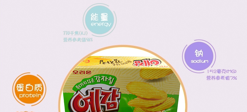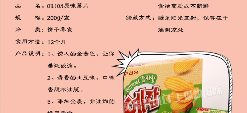 韓國好麗友ORION原味薯片 大盒裝 香脆不油膩 辦公休閑健康小零食 200g/盒—— 1、誘人的金黃色,讓你垂涎欲滴。 2、清香的土豆味,口味香脆不油膩。 3、添加全麥,非油炸的健康零食。 |
