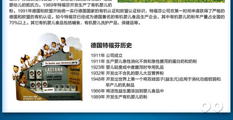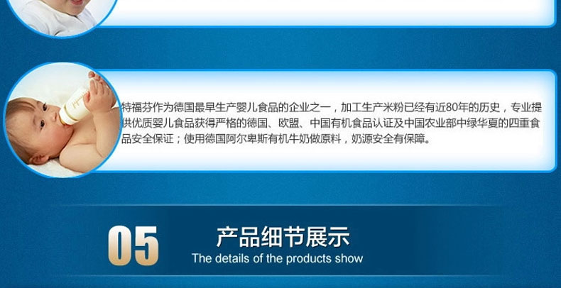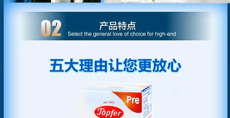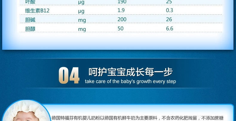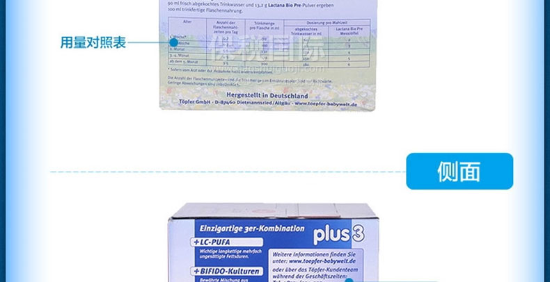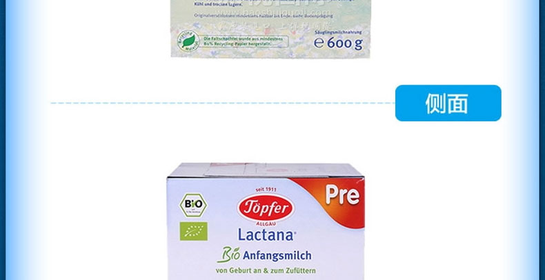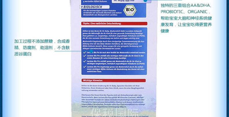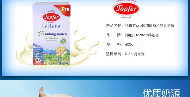 【買4贈一】德國Topfer/特福芬 pre段有機嬰兒奶粉 0-6個月600g/盒—— 1、嚴格按照德國和歐洲有機產品指南標準進行生產,主要原料是有機鮮牛奶和其他來自有機農業的成分,不含殺蟲劑、激素、抗生素、化肥殘留及轉基因物質; 2、添加活性益生菌有效抑制有害菌的生長,促進消化,有效改善寶寶便秘、腹瀉、腹脹等常見腸胃問題; 3、添加DHA、AA,促進寶寶大腦、視覺神經的發育; 4、易于消化的有機碳水化合物; 5、優質有機蔬菜油; 6、三段特別添加了有機水果提取物(有機蘋果、香蕉、橙子); 7、不含蔗糖,不含合成香精,不含助溶劑; 8、不含麩質谷蛋白; 9、應用最新的營養學知識,促進嬰兒的健康發展。 |