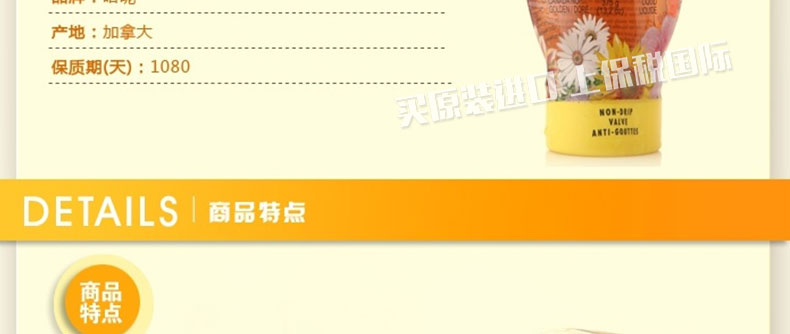 加拿大Naturoney 哈昵黃花蜂蜜 野生黃菊花蜂蜜 單花蜂蜜 保健食品 375g/罐—— 1、加拿大原裝進口的野生黃菊花單花蜂蜜。 2、富含抗氧化成分,維生素和礦物質。 3、防滴漏瓶口和順手包裝設計,方便實用。 |