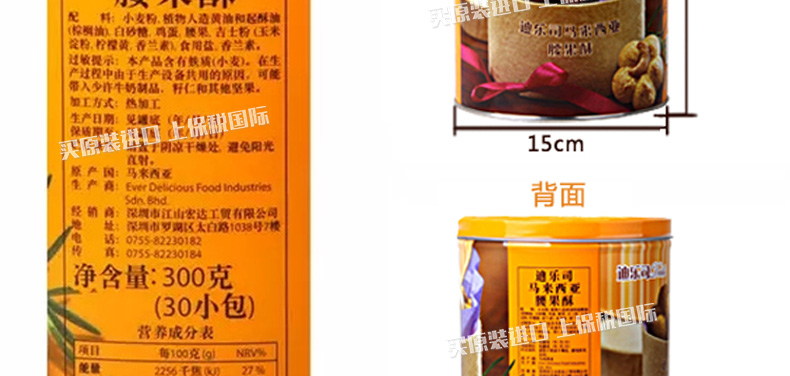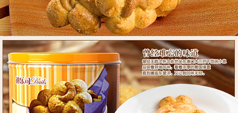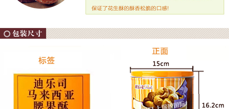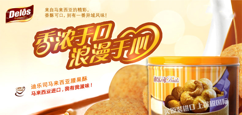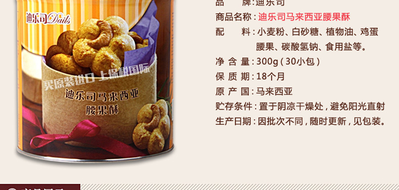 馬來西亞DAILS 迪樂司腰果酥 香濃酥脆不油膩 辦公休閑零食 糕點點心 300克/罐—— 1、優質原料,一流烘焙技術,更香更脆。 2、純正馬來西亞風味,讓人回味無窮。 3、獨立小包裝,即取即食,方便衛生。 |
