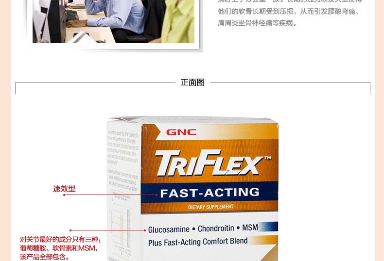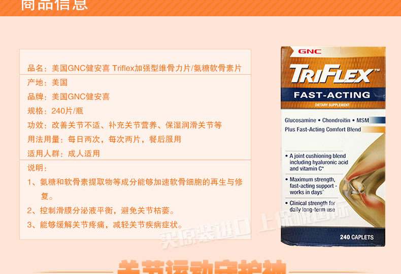美國GNC健安喜 Triflex加強型維骨力片/氨糖軟骨素片 緩解關節疼痛 促進軟骨細胞再生 240片/瓶—— 1、氨糖和軟骨素提取物等成分能夠加速軟骨細胞的再生與修復。 2、控制滑膜分泌液平衡,避免關節枯萎。 3、能夠緩解關節疼痛,減輕關節疾病癥狀。 |