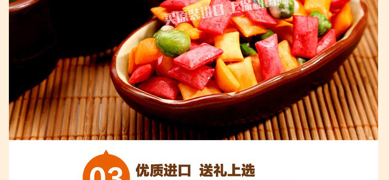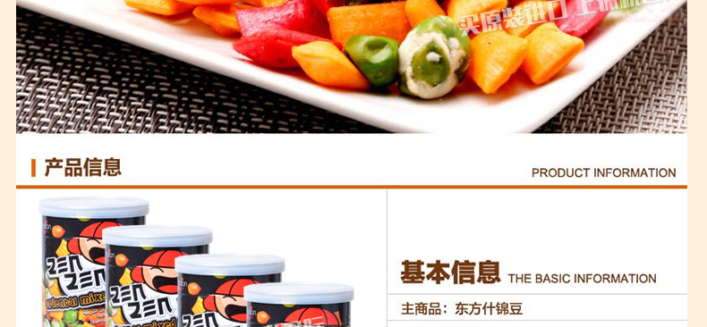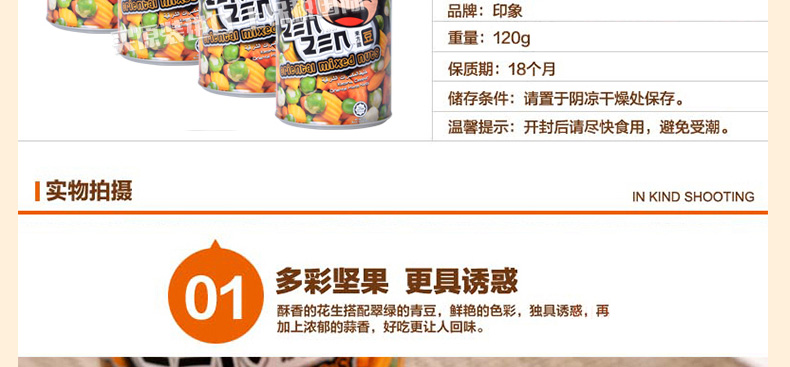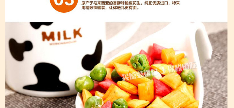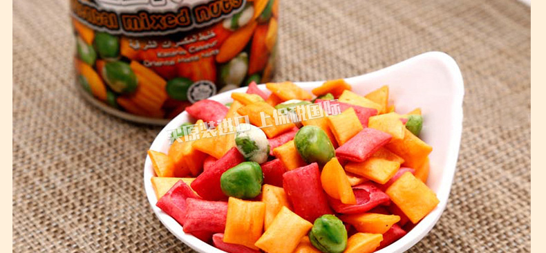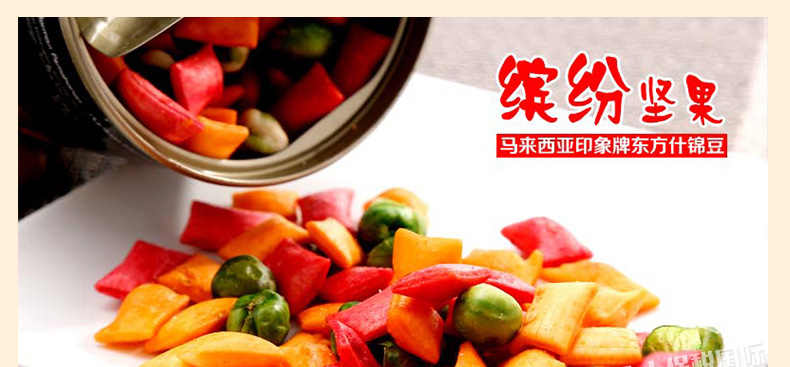 馬來西亞印象牌東方什錦豆,既有花生,又有青豆,香脆的口感,讓你一口一驚喜,一口一贊嘆;它攜帶方便,開合自如,裝在包包里,讓你隨時隨地,想吃就吃;它的包裝精美,可以做禮品贈送,送家人,送朋友,和他們一起分享美味與歡樂。