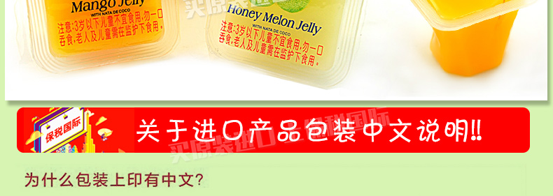 馬來西亞可康牌 芒果哈密瓜味椰纖果肉果凍 果味型布丁休閑零食35g*15杯—— 1、配料:水、把砂糖、椰纖果、乳粉、增稠劑、檸檬酸、果汁(芒果汁、哈密瓜汁)。 2、3歲以下兒童不宜食用,請勿一口吞食,老人及兒童在監護下食用。 |