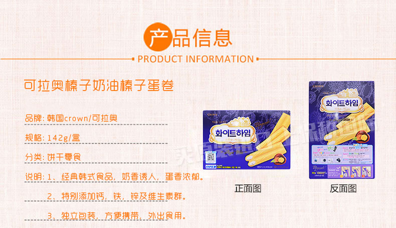 韓國crown 可拉奧榛子奶油榛子蛋卷 中盒裝 酥脆香甜 蛋香濃郁 休閑小零食 142g/盒 —— 1、經典韓式食品,奶香誘人,蛋香濃郁。 2、特別添加鈣,鐵,鋅及維生素群。 3、獨立包裝,方便攜帶,外出食用。 |