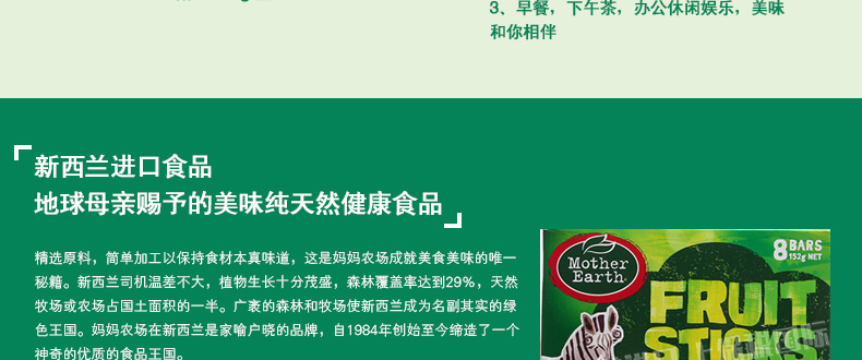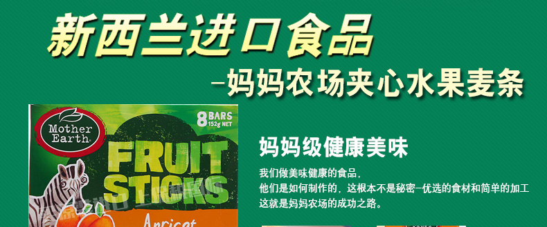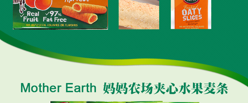 新西蘭Mother Earth 媽媽農(nóng)場夾心水果麥條 蘋果蜜桃味/蘋果味/甜杏味 3種口味任君挑選 休閑辦公零食 152g/盒—— 1、純水果果肉夾心,全麥外層烘焙制作。 2、蘋果蜜桃,蘋果,甜杏,3種口味任選。 3、早餐,下午茶,辦公休閑娛樂,美味和你相伴。 |