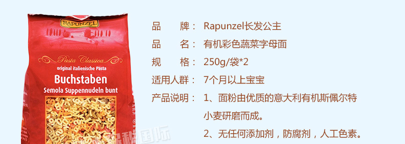 德國Rapunzel長發公主 有機彩色蔬菜字母面 7個月以上寶寶 天然全麥面 250g/袋*2 |