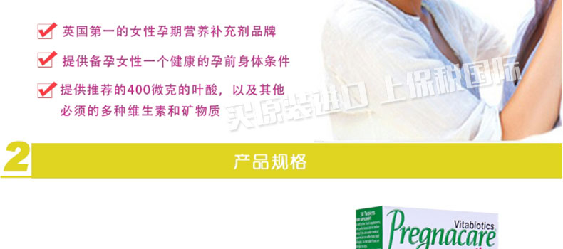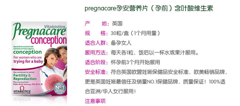2盒裝 英國Pregnacare conception女性孕前營養(yǎng)片 備孕維生素含葉酸 30粒/盒*2(2個月用量) —— 1.主要功能:提前補(bǔ)充營養(yǎng),減少早產(chǎn)的發(fā)生,預(yù)防嬰兒先天性缺陷。 2.懷孕前3個月開始服用,每天1粒飯后服用,不可空腹服用,不可超過指定參考用量。 |