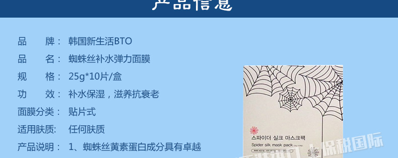 韓國新生活BTO蜘蛛絲補水彈力面膜 保濕滋養 美白緊致抗衰老 25g*10片/盒 |