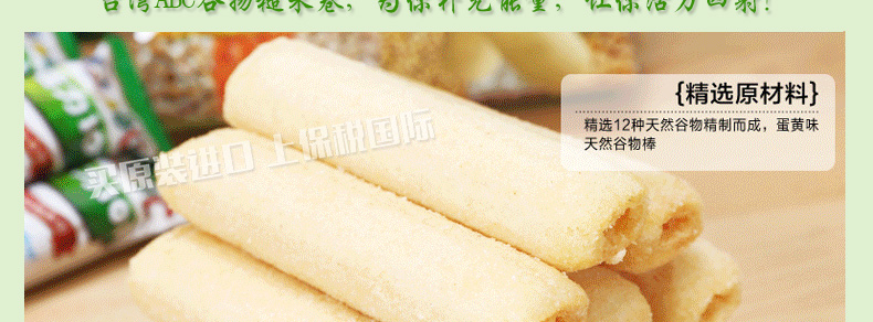 臺(tái)灣ABC谷物糙米卷 雜糧糙米卷活力棒/蒟蒻糙米卷能量棒 酥松柔軟 營(yíng)養(yǎng)美味 非油炸休閑零食 180g/袋—— 1、12種天然谷物以最新技術(shù)制造,非油炸的健康零食。 2、口感酥松柔軟,香味撲鼻又營(yíng)養(yǎng)豐富。 3、具有促進(jìn)血液循環(huán),保持內(nèi)分泌平衡等功效。 |