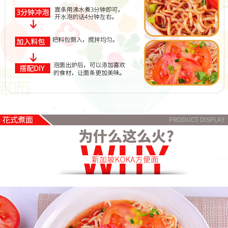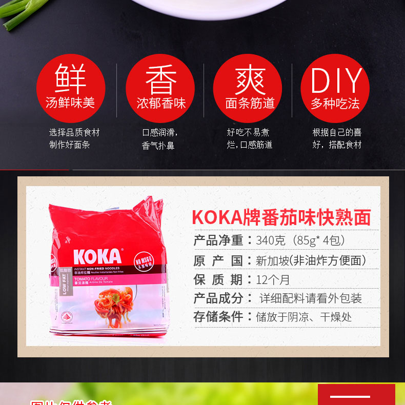 可口牌KOKA 番茄味湯面(非油炸方便面)新加坡綠色健康營(yíng)養(yǎng)快餐 泡面 袋裝 4連包—— 1.蒸熟風(fēng)干而成的可口番茄湯面,口感新鮮。 2.香酥可口,含有豐富的食用纖維,補(bǔ)充每日所需能量。 |