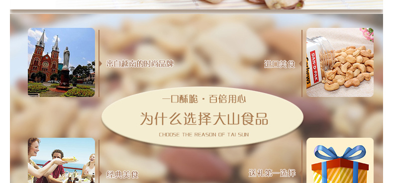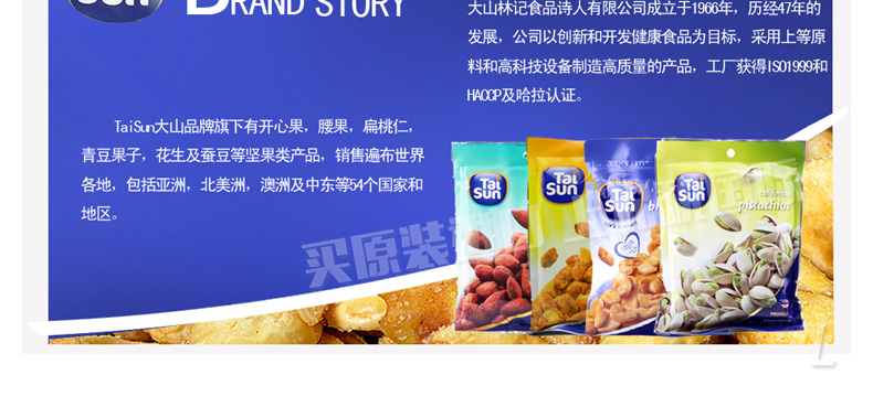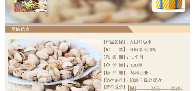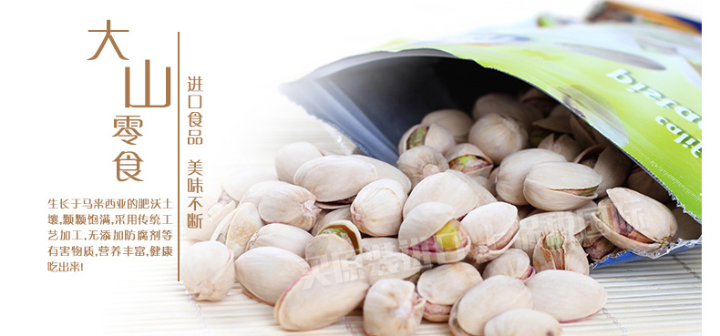 馬來西亞TAISAN 大山開心果 咸香酥脆 優質堅果零食 辦公休閑必備 130g/包—— 1、低脂肪,低卡路里,高纖維的健康零食選擇。 2、無膽固醇,無反式脂肪,無添加劑的安全天然零食。 3、蘊含多種微量元素,補充人體所需營養成分。 |