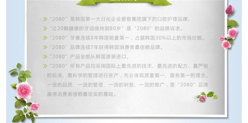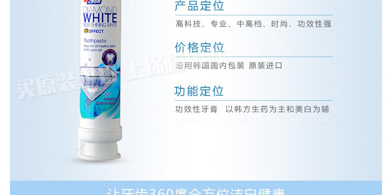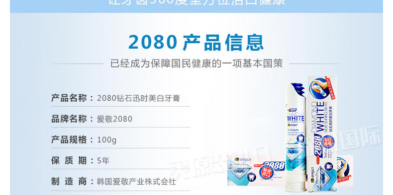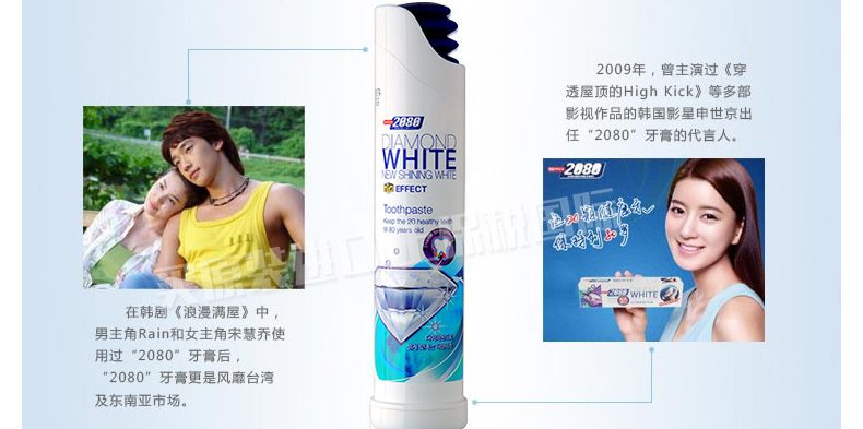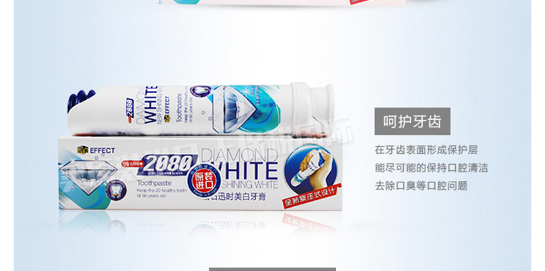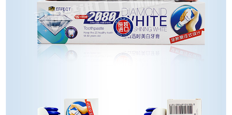 韓國愛敬2080 全新泵壓式鉆石-迅時美白牙膏 亮白防住健齒牙膏 100g/支—— 1、迅速的潔凈能力,雙倍美白顆粒。 2、TSPP焦磷酸鈉成分,保護牙齒表面,有效預防牙垢。 3、打開管蓋,按住頂部氣囊小孔下壓,輕松擠出膏體。 |