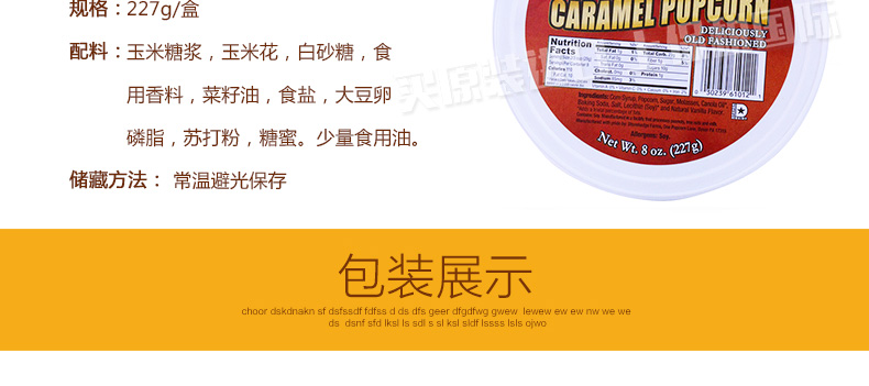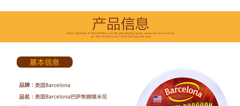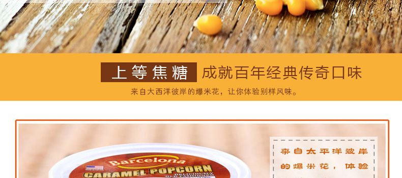 美國Barcelona巴薩焦糖爆米花 原裝進口食品 百年口味甜而不膩 227g/盒—— 1、來自大西洋彼岸的爆米花,讓你體驗別樣風味。 2、不含反式脂肪,易消化,口感香脆,健康又美味。 3、貝里塑料環保密封包裝,開袋即食。 |