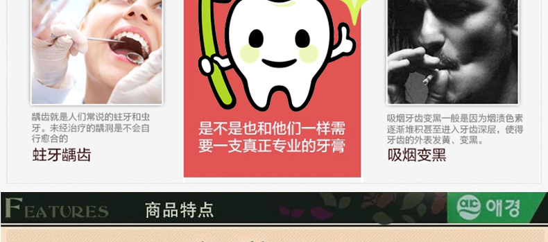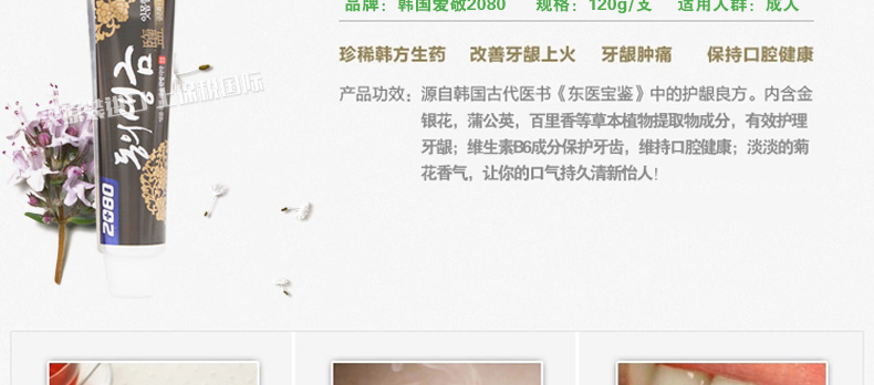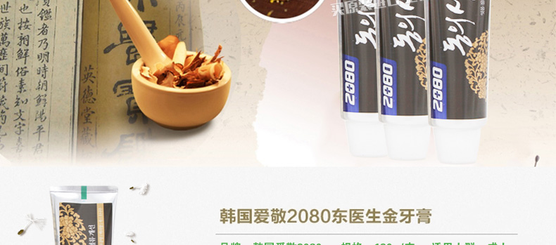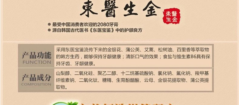 韓國愛敬2080東醫生金牙膏 牙齦護理 清新口氣 120g/支—— 1、蘊含金銀花,蒲公英,百里香等草本植物提取物。 2、有效保護牙齦健康,維持健康的口腔環境。 3、淡淡的菊香,能夠保持口氣清新。 |
